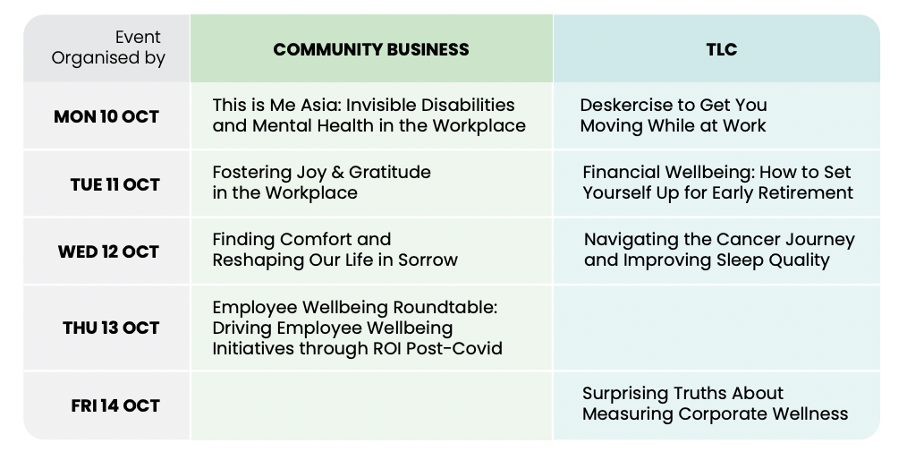 Since 2008, Community Business has been running Employee Wellbeing Week, providing a platform to raise awareness, educate and motivate action around Employee Wellbeing. In celebration of World Mental Health Day on 10 Oct, Community Business invites organisations across the region to join Wellbeing at Work Week to promote and encourage Employee Wellbeing in the workplace. This campaign, which will take place between 10 Oct and 14 Oct, will encourage organisations to actively communicate their passion around workplace wellbeing with their employees. The programme will utilise collective efforts among participating companies in Asia to increase awareness and engagement around Employee Wellbeing in their organisations as well as around the region.